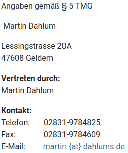 Dieses Impressum gilt für die Informationsangebote von dahlums.de in Geldern im Internet, die über die URL www.dahlums.de erreichbar sind und durch den Vermerk "© dahlums.de" gekennzeichnet sind. Für alle anderen Seiten auf diesem WWW-Server liegt die redaktionelle Verantwortung bei den jeweiligen Stellen oder Personen, die die Seiten erstellt und veröffentlicht haben.